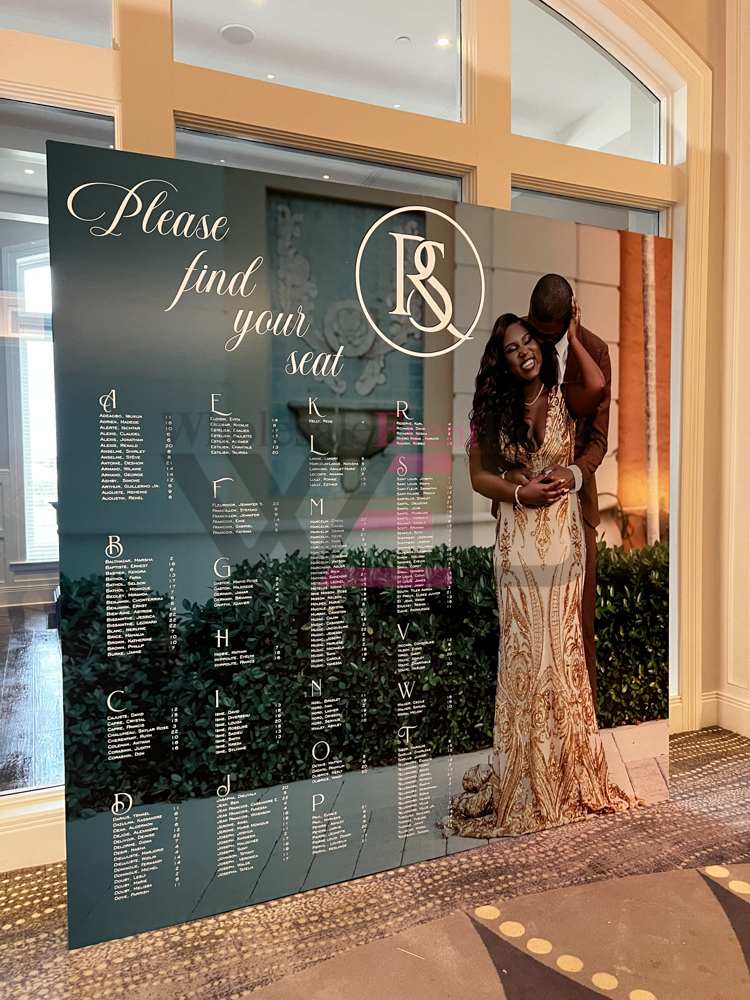 Offering a giant printed portrait or custom seating chart can make a bold and memorable statement at various types of events. This is a way to stand out in a competitive market. All you need is a 4’x8′ sheet of foam board which can be purchased at your local hardware store or retailer. We design, print and ship your ready to install prints.